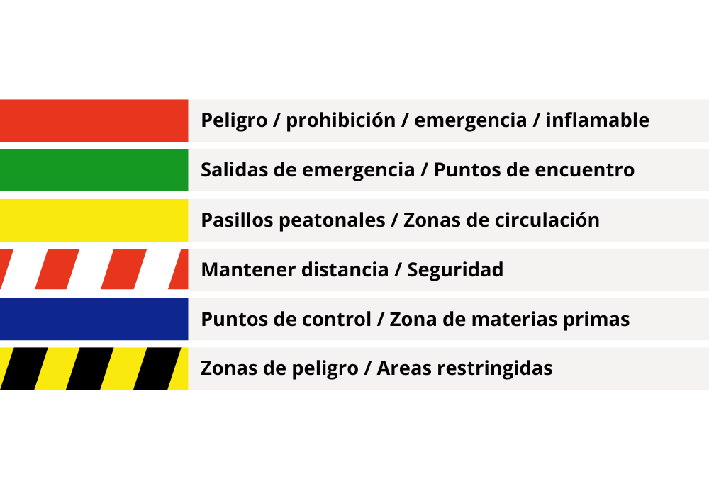 A continuación, encontrarás una guía con los colores más utilizados en las cintas de señalización y demarcación, junto con su aplicación recomendada según el entorno: